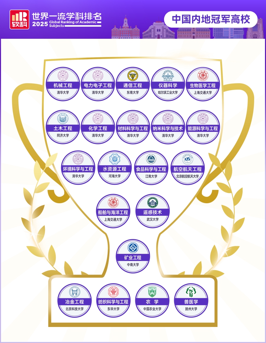 这些“世界一流”中的冠军学科,分别是清华大学(机械工程、电力电子工程、化学工程、材料科学与工程、纳米科学与技术、能源科学与工程、环境科学与工程)、上海交通大学(生物医学工程、船舶与海洋工程)、东南大学(通信工程)、哈尔滨工业大学(仪器科学)、同济大学(土木工程)、河海大学(水资源工程)、江南大学(食品科学与工程)、北京航空航天大学(航空航天工程)、武汉大学(遥感技术)、中南大学(矿业工程)、北京科技大学(冶金工程)、东华大学(纺织科学与工程)、中国农业大学(农学)、扬州大学(兽医学)。其中,扬州大学首次拥有全球冠军。