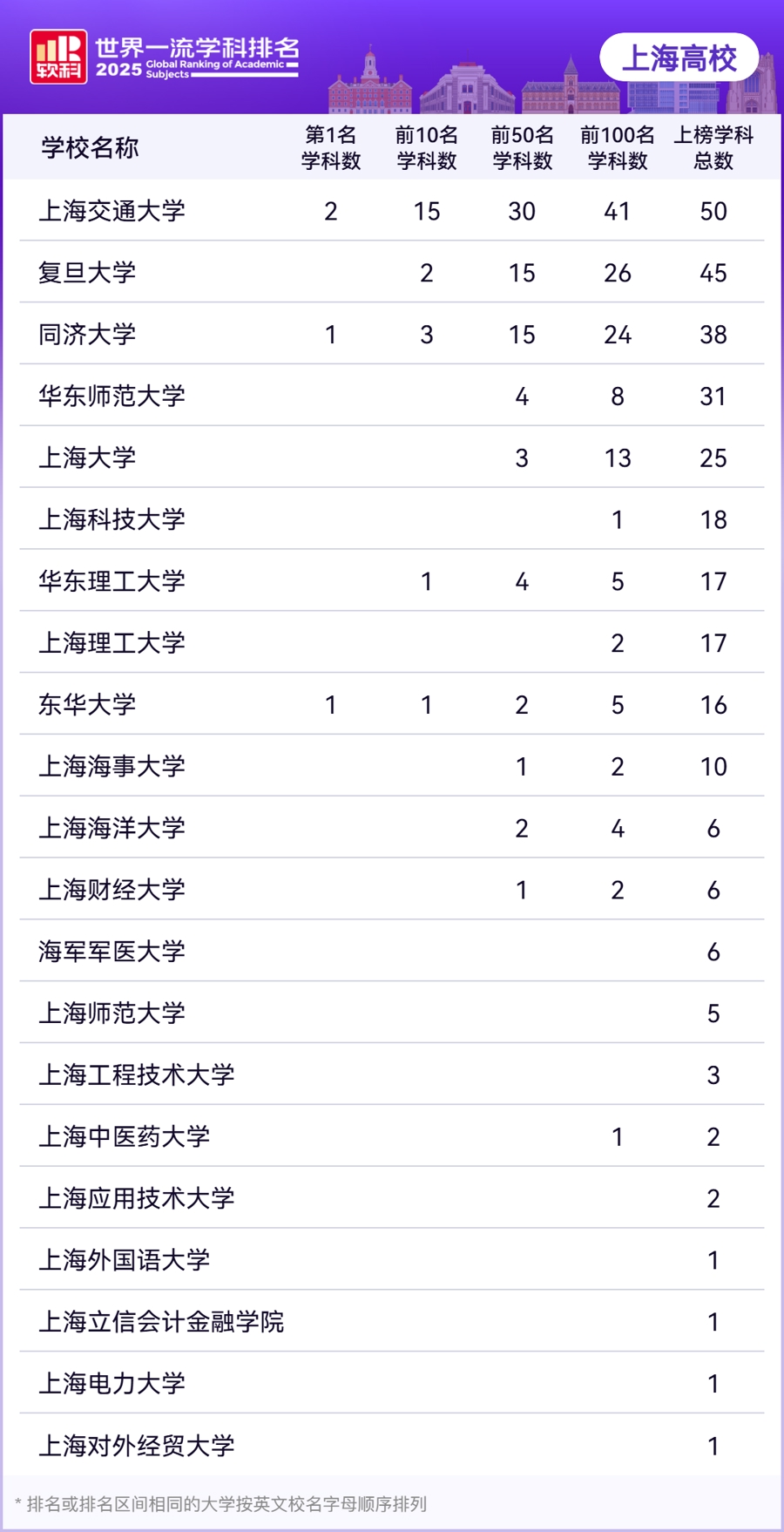 十强排名中,上海共有22个学科跻身其列。除了4个冠军学科之外,上海交通大学的能源科学与工程(第2名)、纳米科学与技术(第3名)均进入全球前三名行列。其他上榜全球TOP 10的学科还有:上海交通大学的海洋科学(第4名)、冶金工程(第4名)、计算机科学与工程(第5名)、化学工程(第6名)、机器人科学与工程(第6名)、机械工程(第8名)、控制科学与工程(第8名)、生物工程(第8名)、通信工程(第9名)、仪器科学(第9名)、材料科学与工程(第10名);复旦大学的药学(第4名)、纳米科学与技术(第9名);同济大学的交通运输工程(第5名)、遥感技术(第10名)。