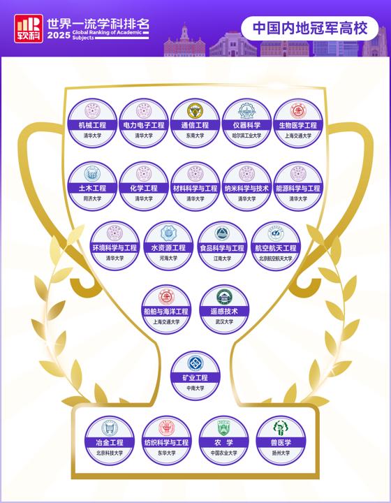 2025软科世界一流学科排名中,中国内地高校在电力电子工程、生物医学工程、材料科学与工程3个学科首度问鼎世界第一,使得中国内地高校的全球冠军学科增加到21个。分别是清华大学(机械工程、电力电子工程、化学工程、材料科学与工程、纳米科学与技术、能源科学与工程、环境科学与工程)、上海交通大学(生物医学工程、船舶与海洋工程)、东南大学(通信工程)、哈尔滨工业大学(仪器科学)、同济大学(土木工程)、河海大学(水资源工程)、江南大学(食品科学与工程)、北京航空航天大学(航空航天工程)、武汉大学(遥感技术)、中南大学(矿业工程)、北京科技大学(冶金工程)、东华大学(纺织科学与工程)、中国农业大学(农学)、扬州大学(兽医学)。其中,扬州大学首次拥有全球冠军学科。