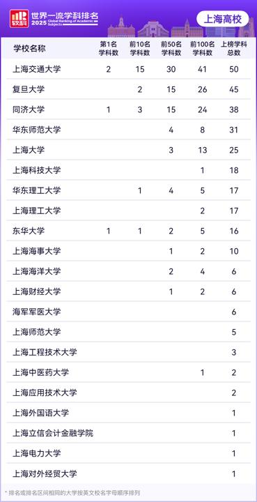 在2025软科世界一流学科排名中,上海高校表现亮眼,21所高校的301个学科榜上有名。从上榜学科总数来看,上海交通大学和复旦大学作为上海高校“领头羊”领跑全市,各有50个和45个学科上榜。同济大学(38个)、华东师范大学(31个)和上海大学(25个)上榜学科超20个。上榜学科数在10个及以上的还有上海科技大学(18个)、华东理工大学(17个)、上海理工大学(17个)、东华大学(16个)和上海海事大学(10个)。